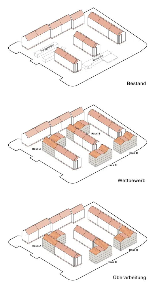 Und nach dieser Entscheidung? Jedenfalls kein Ende der von uns geforderten konzeptionellen Überarbeitungen. Neben den vielen Optimierungen der Wohnungsgrundrisse und erfolgreicher Prüfung auf Entfall eines kostspieligen Kellers prüften wir noch die Anregung aus dem Wettbewerb, ursprünglich vorgesehene Abstände zu den Neubauten auf dem Tankstellengrundstück kurzerhand baulich aufzufüllen. Dadurch wurde es möglich, ohne Wohnflächenverlust auf ein im Zuge der Nachverdichtung vorgeschlagenes Gebäude ganz zu verzichten, da die Abstände zu den bestehenden Gebäuden recht gering gewesen wären. So konnten wir die Wohnqualität im Bestand sichern und gleichzeitig größere Wirtschaftlichkeit durch bessere Auslastung der geplanten Treppenhäuser und Aufzüge bei den Neubauten erreichen. Was will man mehr?