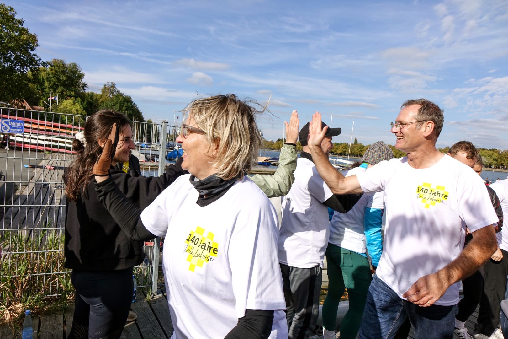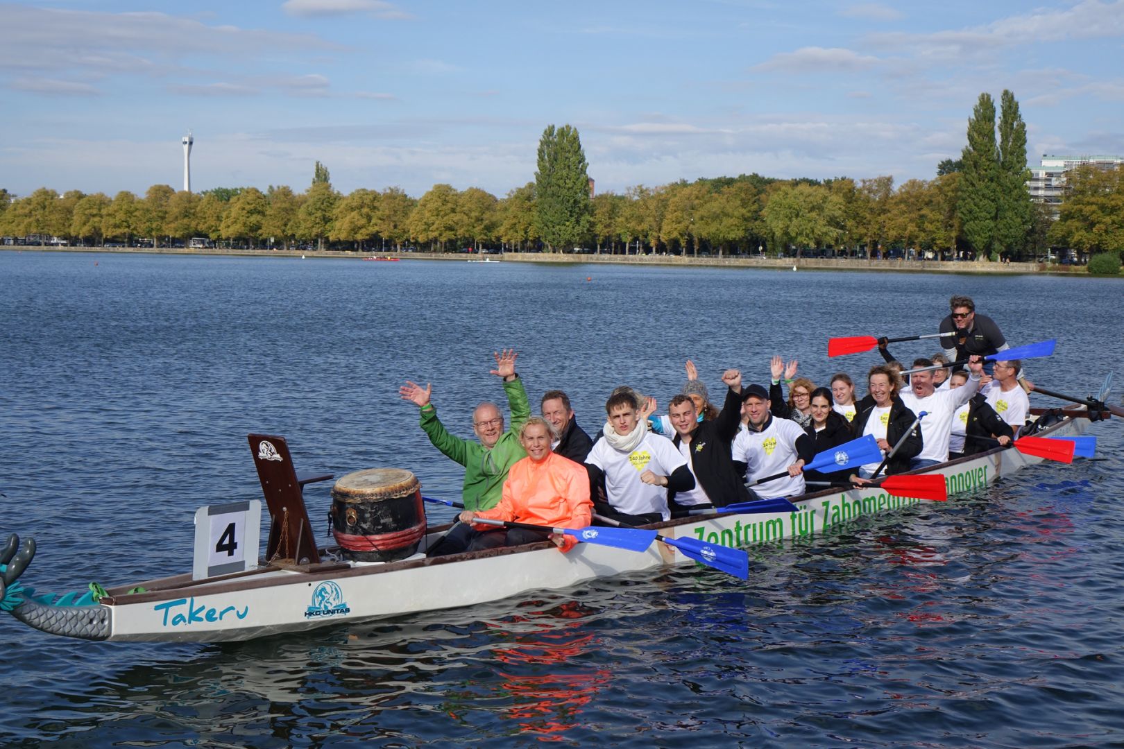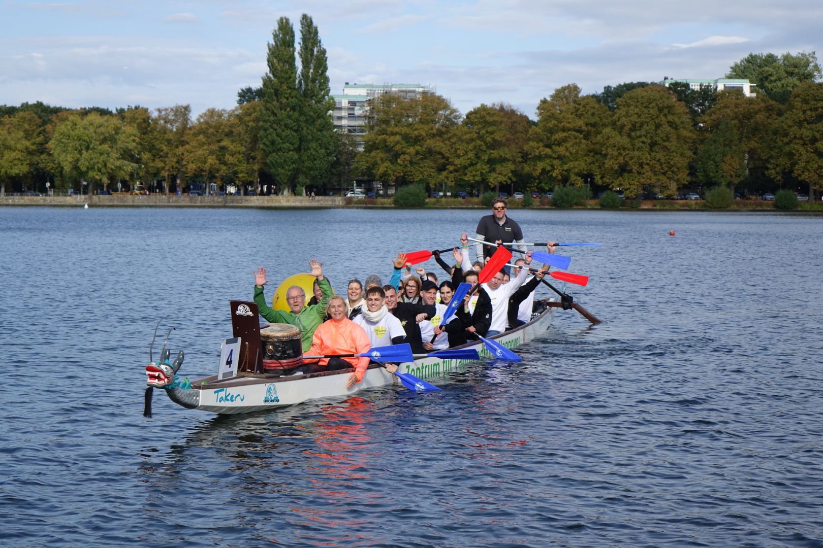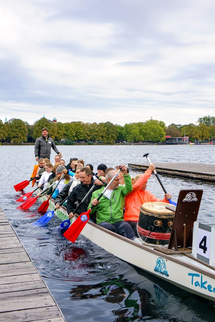 An Bord waren 18 Kolleginnen und Kollegen aus unterschiedlichen Abteilungen. Vorstand Rainer Detjen wollte eigentlich nur zum Anfeuern kommen und hat sich nach kurzer Überredung breitschlagen lassen, mit ins Boot zu steigen, da ein Paddler kurzfristig ausgefallen war. Als passionierter Hobbysegler brachte er viel sportlichen Ehrgeiz mit. Doch der sei nur ein Teil des Drachenboot-Erlebnisses. „Es geht hier in erster Linie ums Mitmachen und um den Spaß am Rennen“, erklärte er fröhlich.