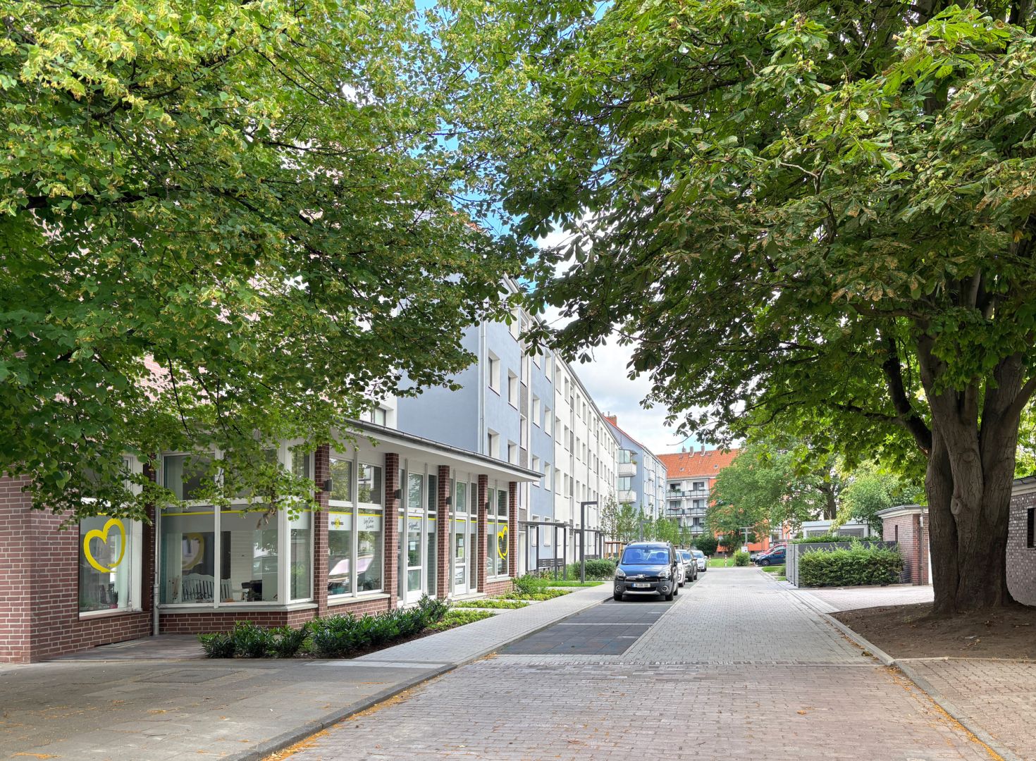 Neben der Technik wurde auch das Wohnumfeld sichtbar aufgewertet. In der Maßmannstraße 1–11 und im Moorkamp 18 in Vahrenwald entstanden neue Grünflächen, Regenwassermulden zur Versickerung, Spielbereiche für Kinder und zusätzliche Fahrradabstellmöglichkeiten. Feuerwehrzufahrten, Wege, Beleuchtung, Müll- und sogar Rollatorhäuser wurden neu gedacht und umgesetzt. Der Mietertreff im Moorkamp 18 erhielt eine neue Terrasse – ein echter Mehrwert für die Nachbarschaft.