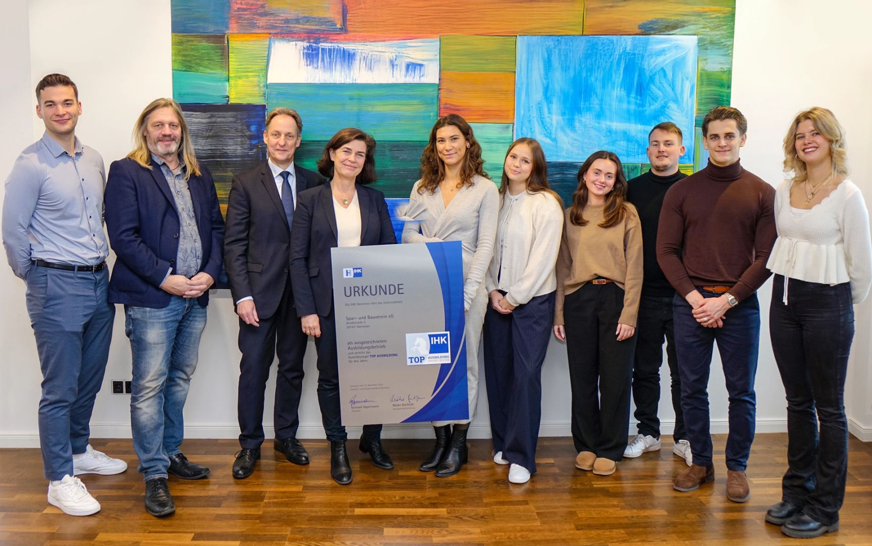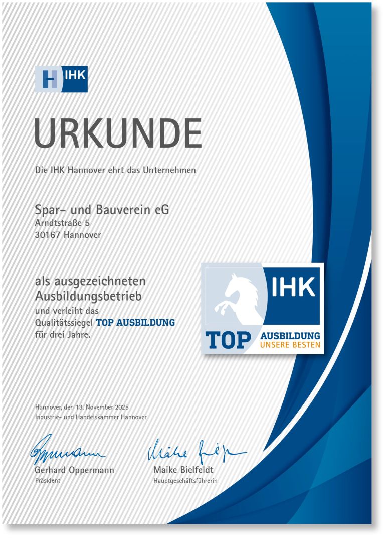Mit attraktiven Rahmen- bedingungen, hoher Ausbildungsqualität und klaren Entwicklungsperspektiven überzeugt spar+bau erneut die IHK Hannover und erhält 2025 zum dritten Mal das Siegel „TOP Ausbildung“.